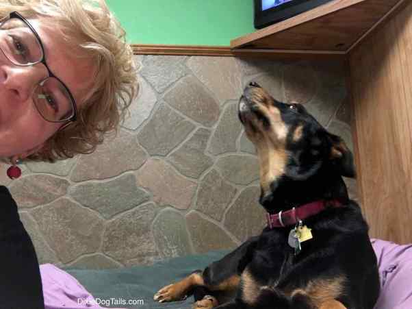 Dixie here. Have you heard of a selfie? My human wanted to take a selfie with me. As you can see, I was busy watching TV. The NASCAR Cup race was on with Logano leading. But she would not give up. So finally I gave up and we took a selfie together! Ruff Ruff! Paw Prints. Dixie