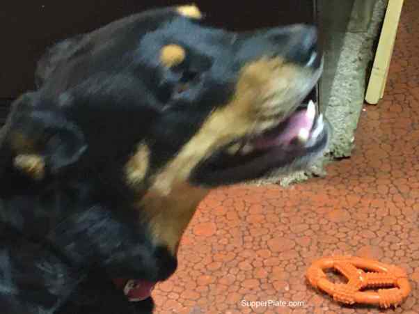 Be prepared for cuteness overload! Recently, I bought Dixie a new toy that she just loves! She is an interesting dog since she loves to share her toys. Either to taunt you or to engage. This orange toy has a chicken flavor which goes over well with her. Dixie loves to grab this toy, run around with it and then want you to play tug of war with her. But we are always careful because we do not want to hurt her. She has a strong jaw and may not realize the danger. The below picture is a touch blurry since I caught her in action. But it is one of my favorites! Look at her eyes. She is just so happy with her toy and wants someone to play with her!