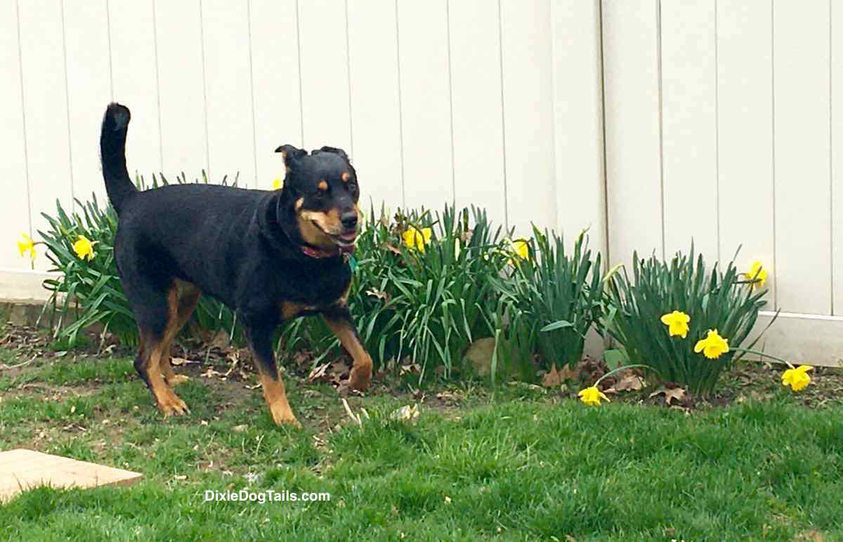 Dixie here! Wishing you a happy day! I have some fun adventures to share with you this week. I have a lot of fun but often I hear “Dixie No”. The humans are always trying to stop my fun! Ruff Ruff. Paw Prints. Dixie.